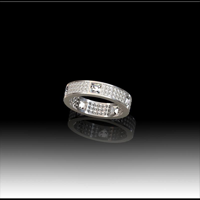 Or 750/1000ème, environ 5grs, poids définitif en fonction du tour de doigt. Poids diamants approchant : princesse 0.90cts et pavage 0.60cts.